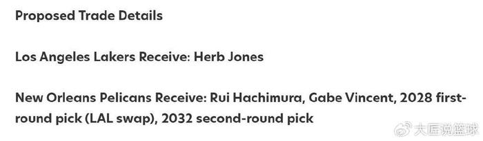 鹈鹕得到:八村垒+文森特+28年湖人首轮互换+32年次轮签。