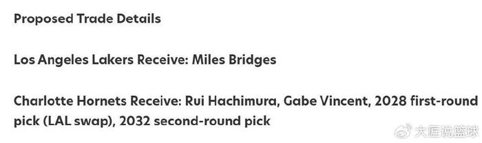 黄蜂得到:八村垒+文森特+28年湖人首轮互换+32年次轮签。